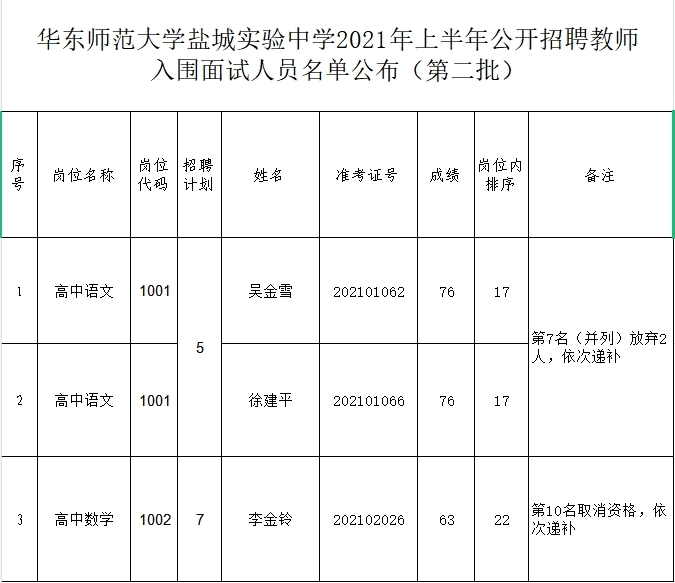 2021年江苏华东师范大学盐城实验中学上半年公开招聘教师入围面试人员名单公布(第二批)