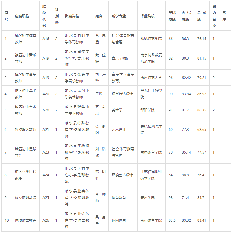 根据《响水县教育系统事业单位2021年公开招聘教师公告》,经过报名、笔试、面试、体检、考察、选岗等相关程序,拟聘用葛思远等10名同志。现将名单公示如下: