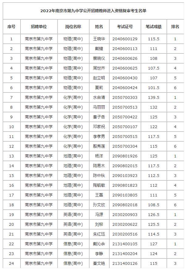 《2022年南京市第九中学公开招聘教师进入资格复审考生名单》(附后)