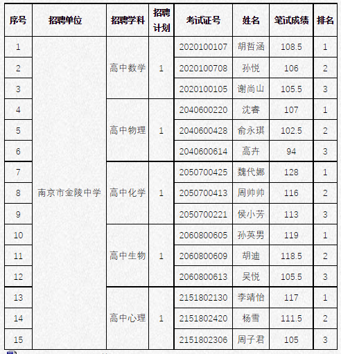 根据《南京市教育局直属学校2022年公开招聘教师公告》(宁事招公告(R)﹝2021﹞100号)要求,现将进入资格复审的考生名单(详见附件)予以公布。请考生务必于2022年1月30日前将《2022年金陵中学应聘人员情况表》发至我校邮箱:jlhsxb@126.com,资格复审具体时间地点等学校邮件通知。有任何疑问请加小编微信66746005