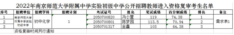 2022年南京师范大学附属中学实验初级中学公开招聘教师进入资格复审考生名单公示