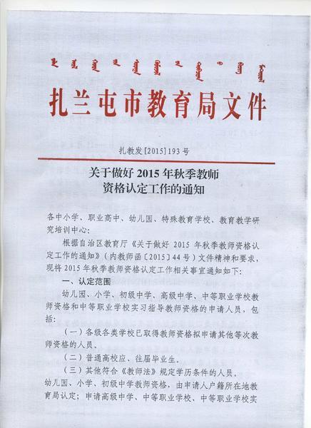 2015秋季内蒙古扎兰屯市教师资格认定通知