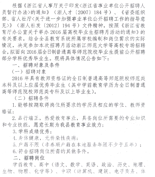2016浙江温州市泰顺县教师招聘50人公告(应届全日制普通高等师范院校毕业生提前)
